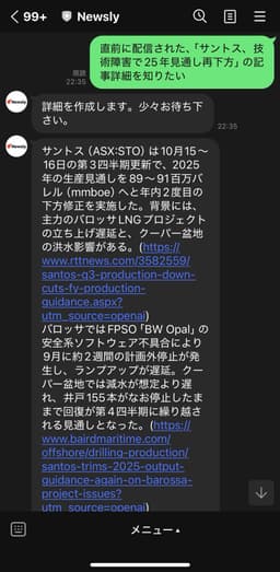 設定したニュースが短い要約でLINEに届くので、内容を素早く把握でき、移動中やスキマ時間にも手軽に最新情報をチェックできます。