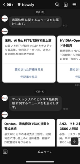 設定したニュースが短い要約でLINEに届くので、内容を素早く把握でき、移動中やスキマ時間にも手軽に最新情報をチェックできます。