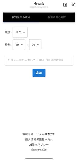 Newslyは、最初に関心のあるキーワードと配信頻度を設定するだけで、国内外の最新ニュースの要約をLINEにお届けするサービスです。